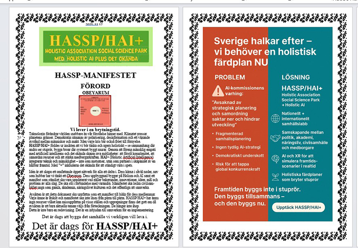 Veckans bilder 2025 v46 HASSP-MANIFESTET Ur förordet Vi lever i en brytningstid. HASSP/HAI+ föddes ur insikten att vi bör tänka och agera holistiskt - se sammanhang där andra ser stuprör, bygga broar där systemet byggt murar. Genom att förena mänsklig empati med artificiell intelligens och det okända skapas nya möjligheter: att förstå komplexitet, att samordna resurser och att stärka medborgarkraften. HAI+ (Holistic Artificial Intelligence) integrerar teknik och mänsklighet - inte som motsatser, utan som partners i skapandet av en hållbar framtid. Med "+" inkluderas det okända för att ständigt vara i spets. Idén är att skapa ett omfattande öppet nätverk för alla att delta i. Dess kärna i såväl noder, nav som hubbar har vi tänkt ett Obeyarum. Dess uppbyggnad bygger på Holism och AI samt ett manifest som ständigt ska vara uppdaterat vad gäller bakgrunder, innovationer, idéer, mål och problem av alla slag. De ska stå i förbindelse med varandra. Manifestet ska locka civilsamhället unga som gamla, akademin, näringslivet kulturen och det offentliga att samverka. Avsikten är att detta